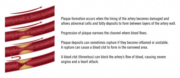 The inside of a coronary artery has a smooth lining through which blood easily flows. Coronary artery disease starts when the lining of the coronary artery is damaged. This often is due to a risk factor, such as smoking, hypertension or diabetes. A plaque deposit (a fatty material composed of cholesterol and other abnormal cells) forms between layers of the artery wall. This buildup, called atherosclerosis, causes the arteries to become stiff and slows the flow of blood to the heart muscle. Over time, buildup of stable plaque can clog the artery and cause a partial or total blockage.