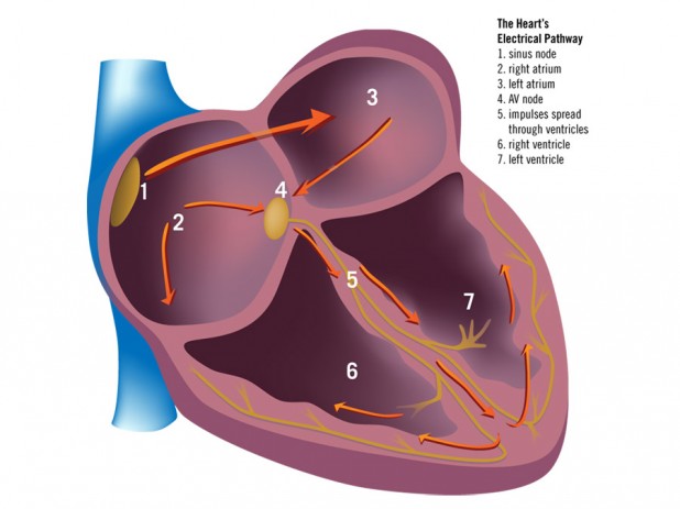 The heart’s pumping action is controlled by an electrical system that sends out impulses, or signals.